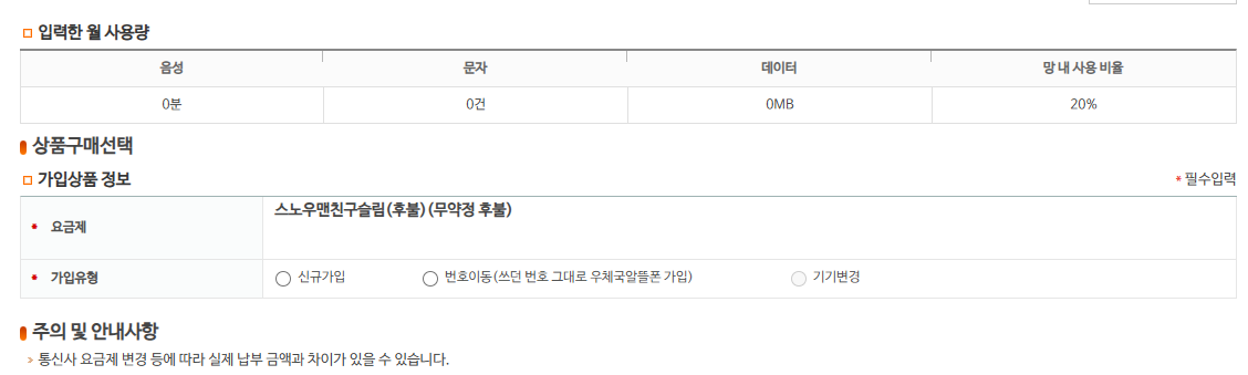 - 요금제 선택: 우체국에 방문하여 스노우맨친구슬림 요금제를 선택합니다.