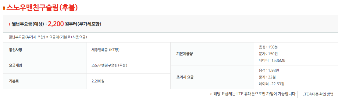 스노우맨친구슬림 요금제의 기본 정보